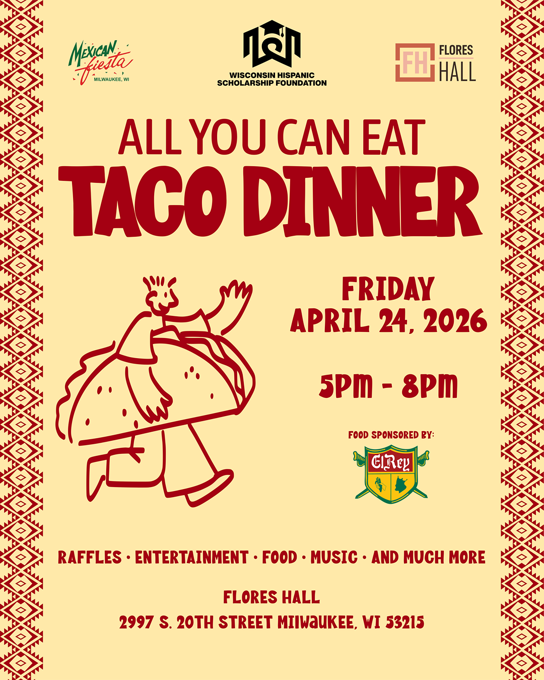 On behalf of the Wisconsin Hispanic Scholarship Foundation, Inc/Mexican Fiesta we are pleased to announce the upcoming Taco Dinner All You Can Eat Fundraiser Event to be held on Friday, April 24th, 2026, from 5:00 pm to 8:00 pm at Flores Hall located at 2997 S. 20th St. Milwaukee, WI 53215. This event will be an evening of fun, food, and entertainment to raise funds for scholarship awards for deserving students in our community.